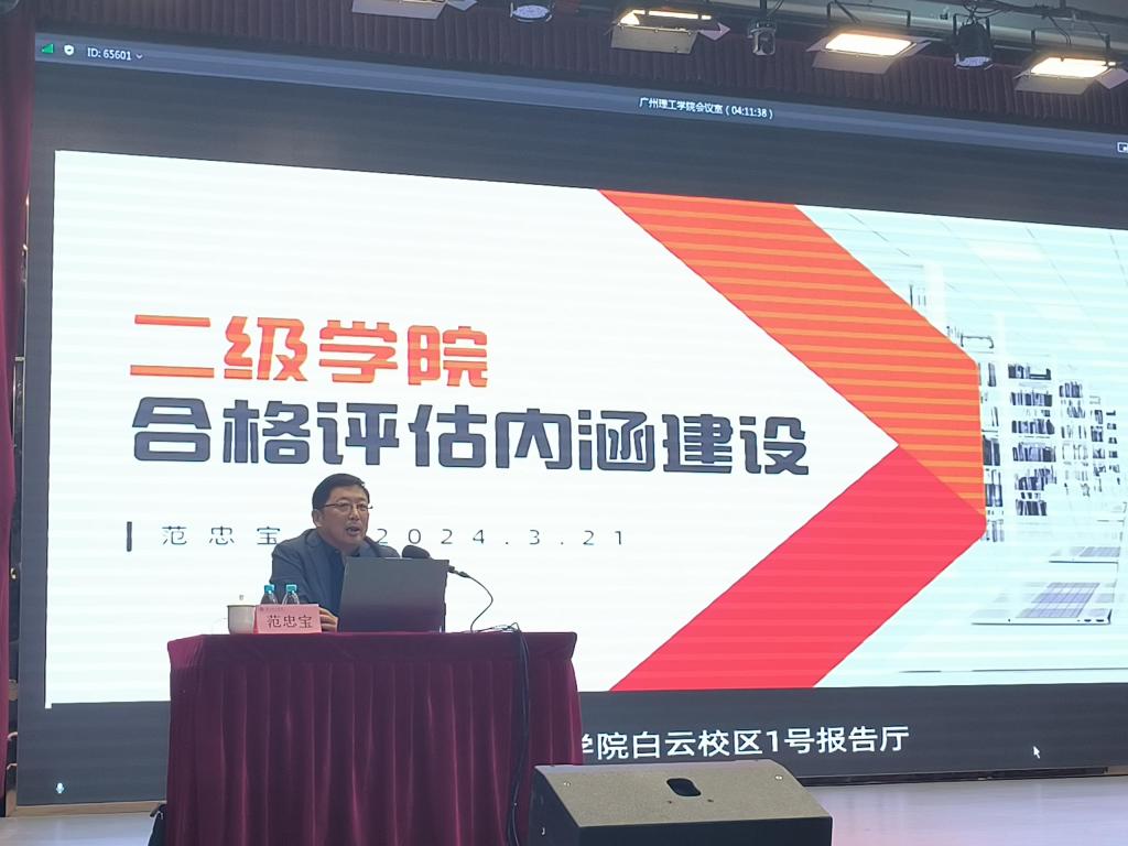 (李美颖)3月21日下午,教育部本科教学工作合格评估核心专家、广东省高校审核评估专家范忠宝教授应邀来校作题为“二级公司合格评估内涵建设”的专题讲座。公司领导、相关职能部门工作人员和各二级公司领导班子、系主任、专任教师参加了讲座,讲座由副董事长张世梅主持。