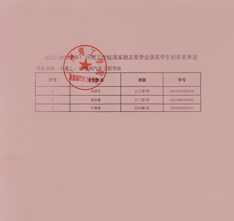 根据《关于开展2023-2024学年国家励志奖学金评选工作通知》(广州理工学助函〔2024〕14号),新能源汽车工程公司本着公平、公正、公开的原则对收到的国家励志奖学金申请材料进行严格评选,现对公司2023-2024学年国家励志奖学金拟通过名单予以公示。公示时间从2024年9月29日至2024年10月2日。如对公示结果有异议,请于公示期间向以下受理途径实名反映。反映情况时需提供真实具体的材料,并签署姓名和联系电话;不提供具体事实材料或不签署真实姓名和联系方式的,所反映情况将不予受理。